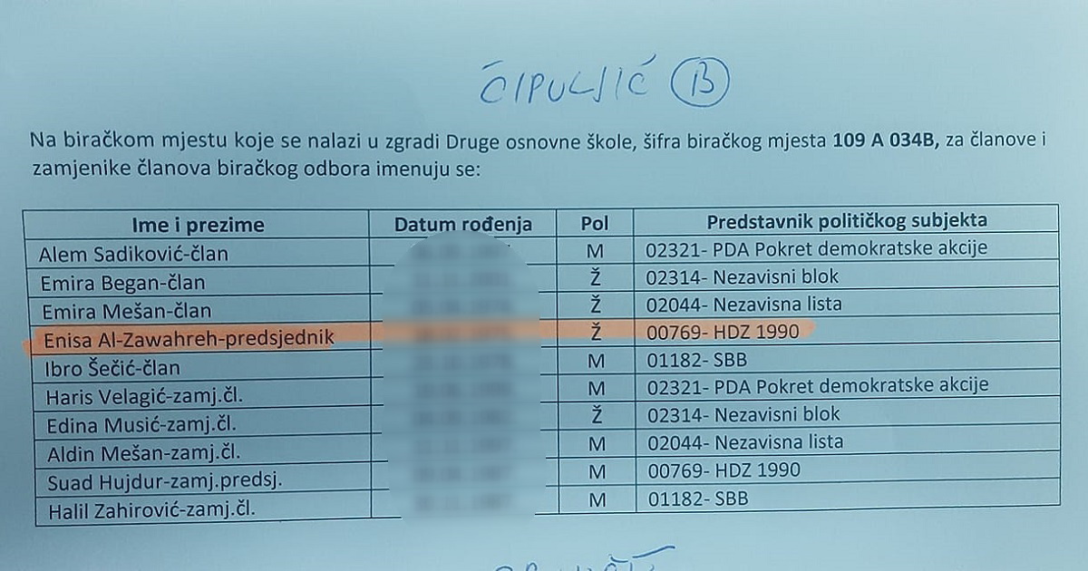 Naime na biračkom mjestu u zgradi Druge osnovne škole (Čipuljić) u Bugojnu predsjednica biračkog odbora je izvjesna Enisa Al-Zawahreh ispred HDZ 1990, a njezin suprug je kandidat na listi SDA za Općinsko vijeće Bugojno.