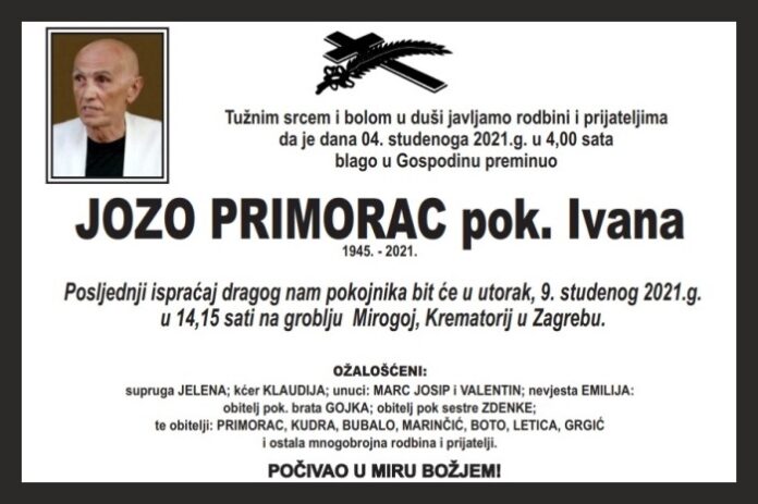 Posljednji ispraćaj dragog nam pokojnika bit će u utorak, 9. studenog 2021.g. u 14,15 sati na groblju Mirogoj, Krematorij u Zagrebu.