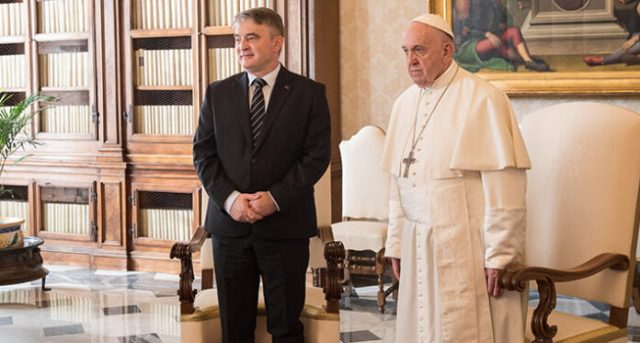 Poglavar Katoličke crkve papa Franjo primio je u ponedjeljak u audijenciju svojoj Privatnoj biblioteci u vatikanskoj Apostolskoj palači predsjedavajućeg člana kolegijalnoga tročlanog Predsjedništva Bosne i Hercegovine Željka Komšića.
