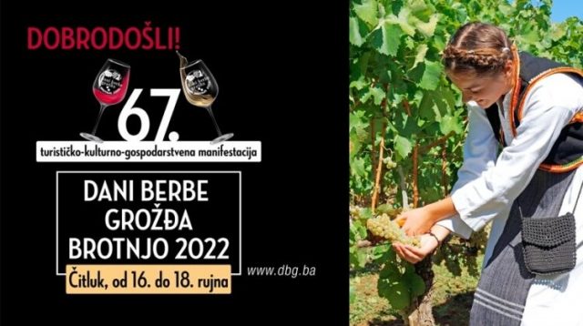 67. Dani berbe grožđa započet će u petak, 16. rujna predstavljanjem knjige Jure Belje i Veselka Sivrića „Agrag i agronomi Brotnja“ te otvorenjem izložbe akademske slikarice Karoline Marušić „Rujanove svečanosti“. Kulturni program u organizaciji Ogranka Matice hrvatske Čitluk započet će u 19 sati u Hotelu Brotnjo.