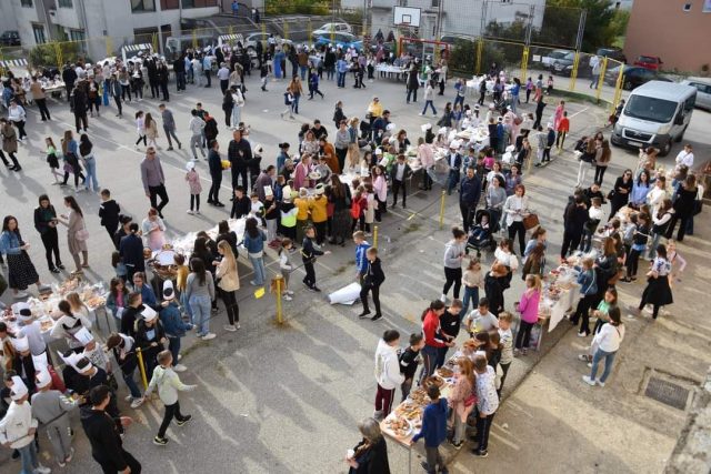Prodajna izložba održana je na školskom igralištu i na prostoru školskog dvorišta, a mnogobrojni posjetitelji mogli su izabrati nešto za sebe u bogatoj ponudi slastica i peciva koje su mališani, uz pomoć svojih roditelja, baka i djedova te djelatnika OŠ fra Didaka Buntića, pripremili za današnju proslavu.
