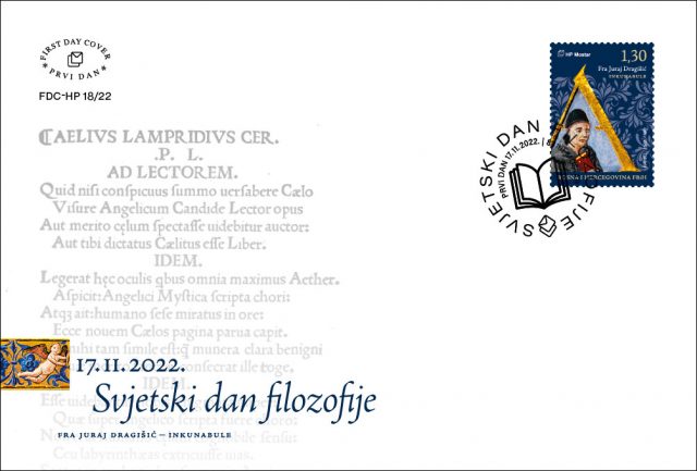 Hrvatska pošta (HP) Mostar tiskala je prigodnu poštansku markuu povodu Svjetskog dana filozofije s motivom inkunabula fra Jurja Dragišića.