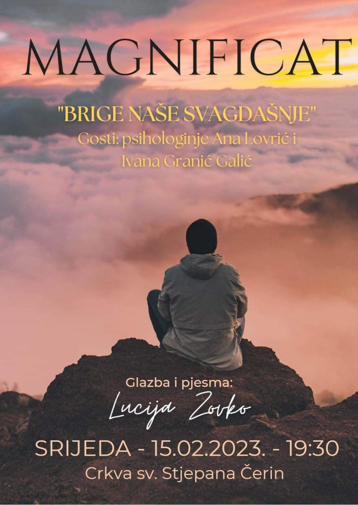 U srijedu, 15. veljače 2023. u župnoj crkvi u Čerinu bit će 4. Magnificat. Nastupaju:Ana Lovrić, mag. psihologije i Ivana Granić Galić, univ. spec. kliničke psihologije s temom: “Brige naše svagdašnje”.