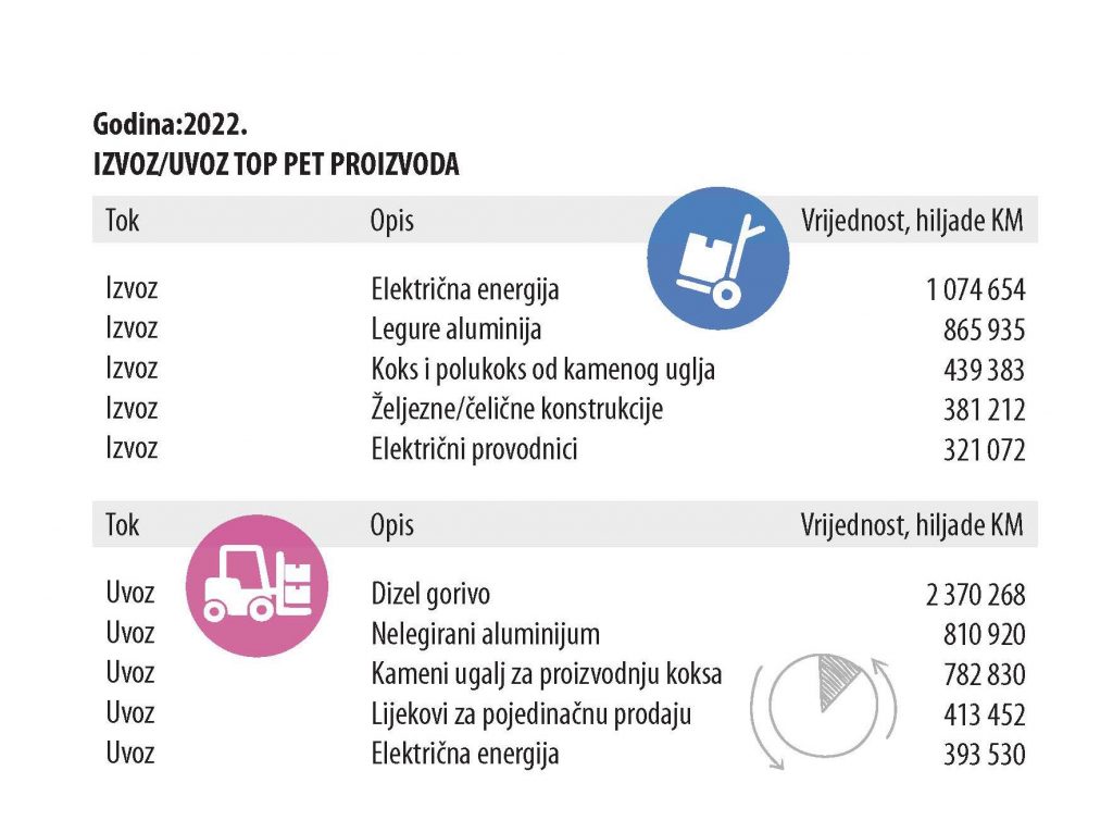 U 2022. godini Bosna i Hercegovina je najviše izvezla električne energije i to vrijednosti od jedne milijarde i 74 milijuna KM, a uvezla dizel goriva u vrijednosti dvije milijarde i 370 milijuna KM, objavila je Agencija za statistiku BiH u publikaciji “Bosna i Hercegovina u brojevima 2022.”