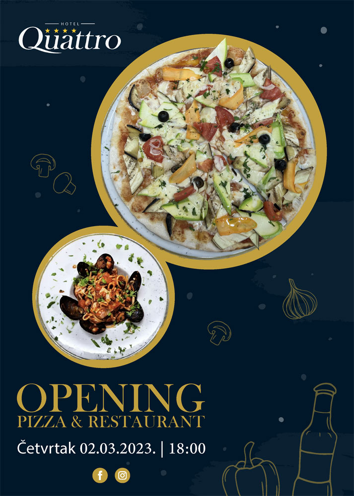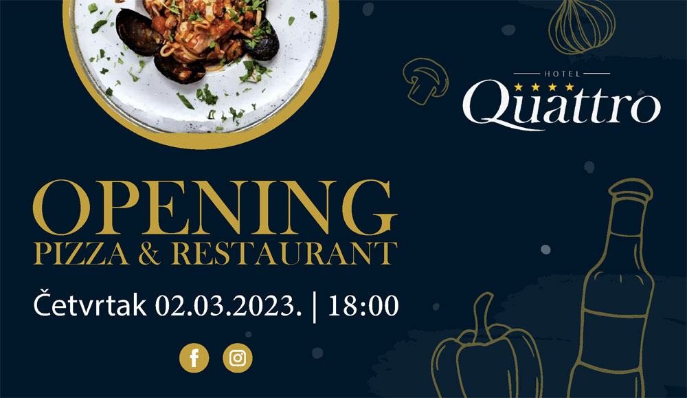 Sa zadovoljstvom Vam možemo najaviti da u sklopu hotela Quattro, u četvrtak 02. ožujka 2023. u 18:00h otvaramo vrata našeg restorana za sezonu 2023.