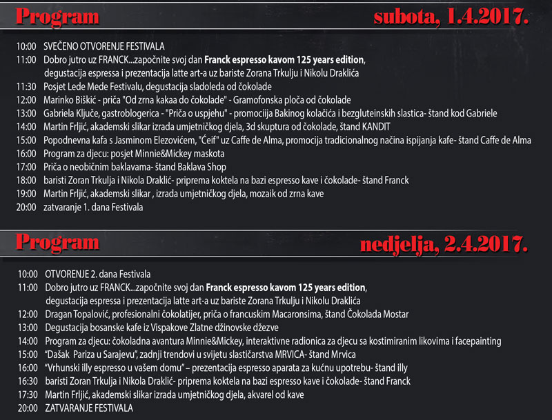 U bogatoj satnici događanja niz je zanimljivosti: u suradnji s Franckom, poznati baristi Zoran Trkulja i Nikola Draklić, jedini baristi u BiH sa službenim certifikatom međunarodnog udružanja Speciality Coffee Association, radite će Franck espresso kavom 125 years edition, prezetacije latte art-a, te će pripremati koktele na bazi kave i čokolade, koje ćete moći isprobati.