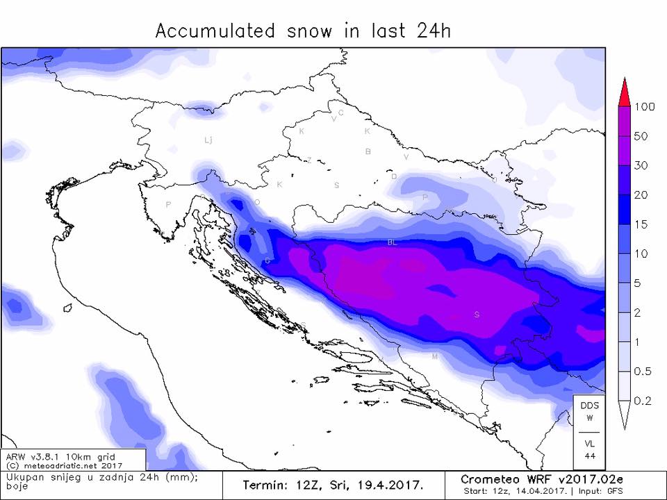 Kako navodi, količine snijega u gorju po simulacijama prognostičkih modela su zaista impresivne, što se može vidjeti na fotografiji ispod