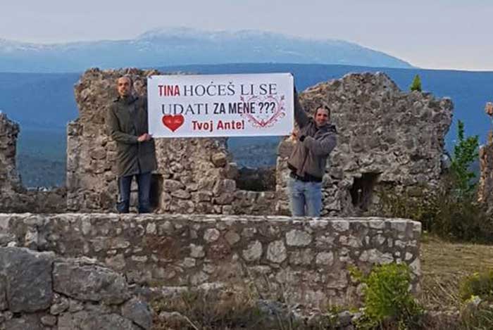 Ante je to učinio romantičnom porukom zajedno sa svojim prijateljima. Na velikom platnu koji su držali Antini prijatelji Ruđo i Milan na brdu iznad Ljubuškog pisalo je: TINA, hoćeš li se udati za mene??? Tvoj Ante!