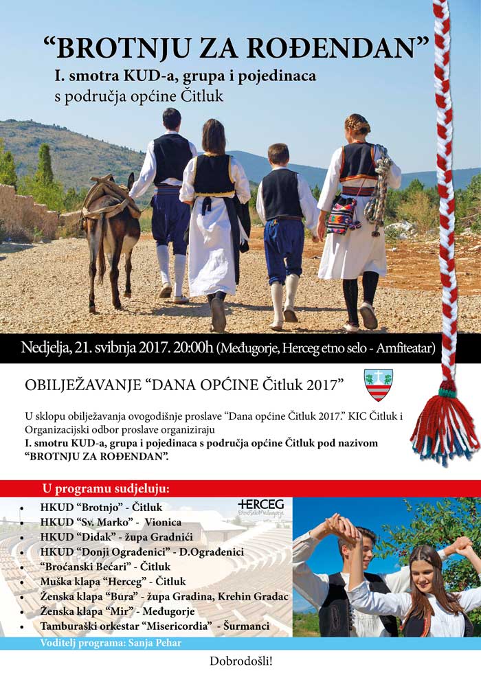 U sklopu održavanja ovogodišnje proslave 24. svibnja, Dana općine Čitluk i 711. obljetnice prvog pisanog spomena imena Brotnjo, Kulturno-informativni centar Čitluk i Organizacijski odbor proslave organiziraju I. smotru kulturno-umjetničkih društava, grupa i pojedinaca s područja općine Čitluk pod nazivom „Brotnju za rođendan“.