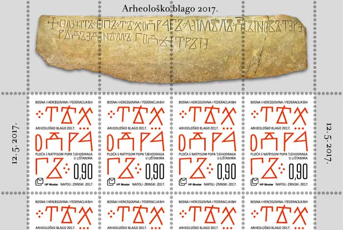 Hrvatska pošta (HP) Mostar izdala je redovitu poštansku marku „Arheološko blago 2017. – Ploča s natpisom popa Tjehodraga u Lištanima“ u arku od 8 maraka + 4 vinjete, žig i omotnicu prvoga dana (FDC).