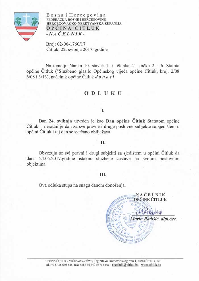Ovom odlukom svi pravni i drugi subjekti sa sjedištem u općini Čitluk obvezuju se da na ovaj dan istaknu službene zastave na poslovnim objektima.