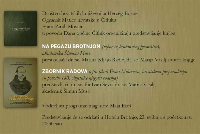 U povodu Dana općine Čitluk Društvo hrvatskih književnika Herceg-Bosne, Ogranak Matice hrvatske u Čitluku i Fram-Ziral Mostar organiziraju predstavljanje knjiga u Hotelu Brotnjo u utorak 23. svibnja 2017. godine s početkom u 20:30 sati.