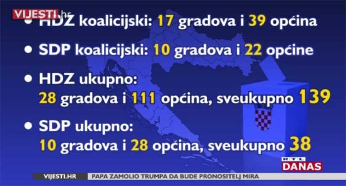 HDZ dodatno koalicijski uzima još 17 gradova i 39 općina. SDP – 10 gradova i 22 općine.