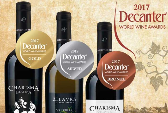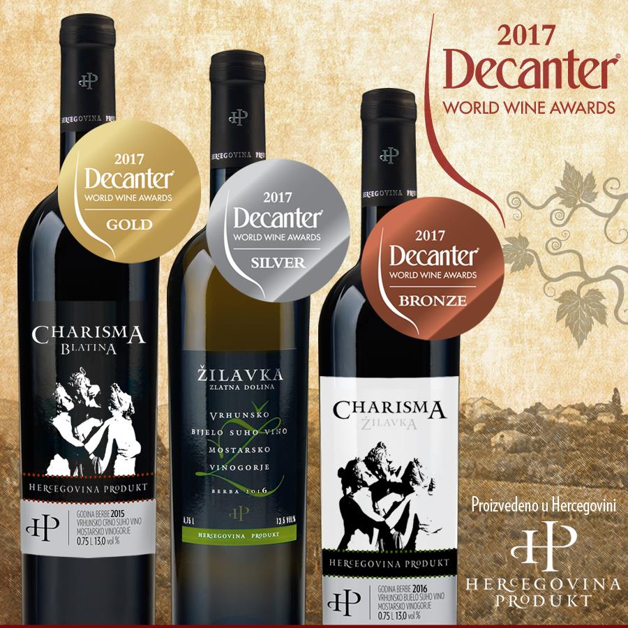 Na ovogodišnjem Decanter World Wine Awards ocjenjivanju u Londonu vinarija Hercegovina Produkt osvojila je čak 3 medalje, među kojima je svakako najznačajnija zlatna medalja za vino „Charisma Blatina 2015“ sa visokih 95 bodova, objavljeno je na facebook stranici Hercegovina Produkta.