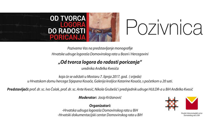 U srijedu 7. lipnja u Galeriji kraljice Katarine Kosača u Hrvatskom domu hercega Stjepana kosače u Mostaru s početkom u 20 sati biti će predstavljena monografija „Od tvorca logora do radosti poricanja“ autora Anđelka Kvesića koja je tiskana u nakladi Hrvatske udruge logoraša Domovinskog rata u BiH.