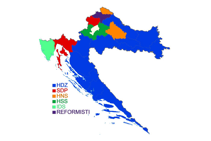U Sisačko-moslavačkoj županiji vodi HDZ-ov župan Ivo Žinić (HDZ, HSP AS, HSLS, HKS, HSU, DSU, SBH) pred denkom Vahovcem (SDP, HNS, SDSS, SDA Hrvatske, Laburisti, HSS braće Radić, SU).