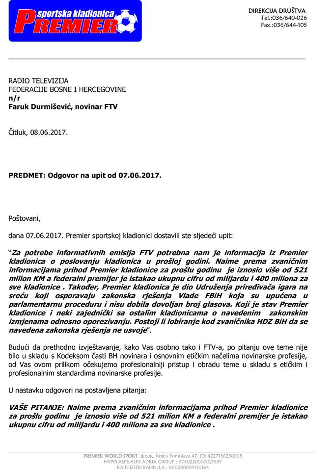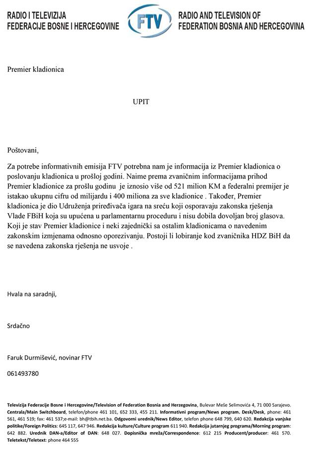 S upitom Sportskoj kladionici Premier javio se Faruk Durmišević, novinar FTV-a kojeg od ranije pamtimo po jednostranim prilozima protiv kladionica, a način na koji je ovaj novinar formulirao najnovija pitanja upozorava nas da u subotu možda ne moramo očekivati realan, profesionalan i objektivan TV prilog po etičkim standardima novinarske profesije.