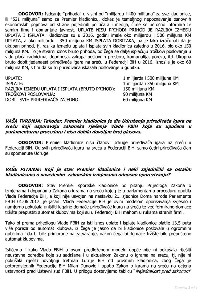 Tako Durmišević u pitanjima ukupno zaprimljene uplate kladionica predstavlja kao prihod, iako se dobro zna da je prihod razlika između uplata i isplata. I kao šlag na kraju, Durmišević nas otvoreno pita: “Postoji li lobiranje kod zvaničnika HDZ BiH da se navedena zakonska rješenja ne usvoje”.