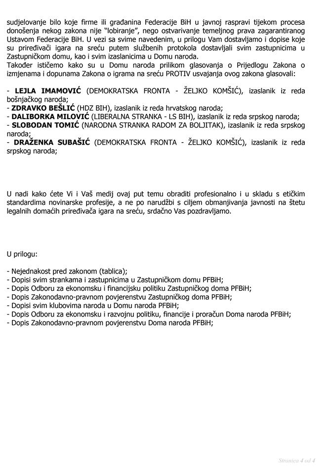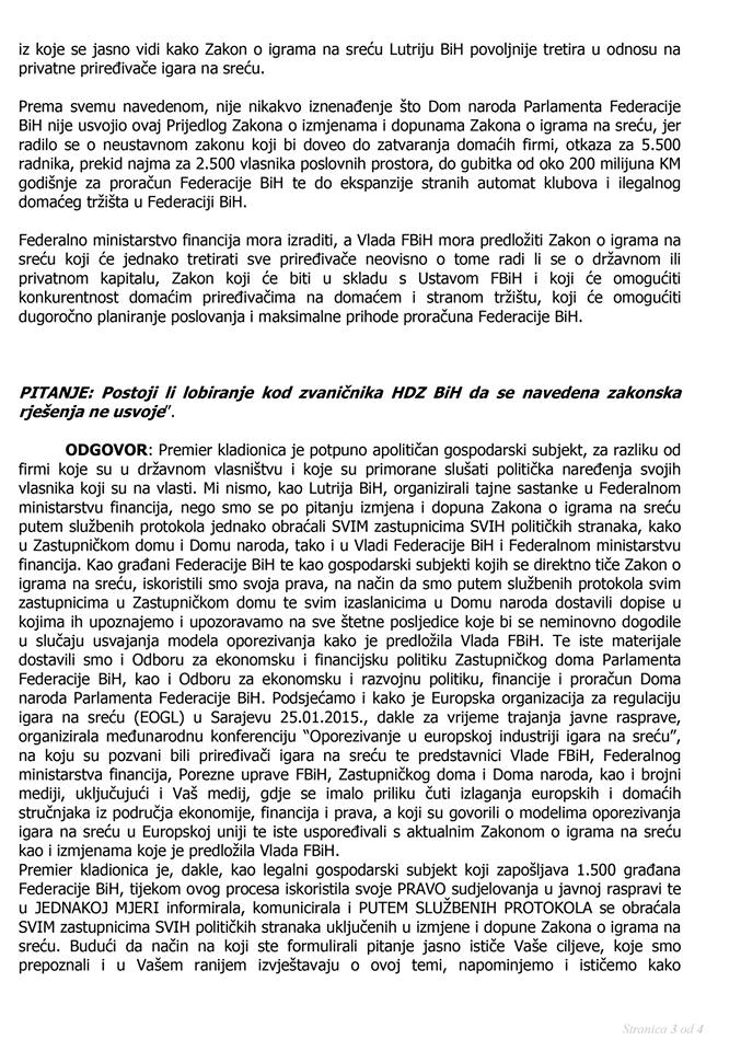 Durmiševiću i FTV-u smo poslali jasan i precizan odgovor, pojasnili sve ono što se čini da ne znaju te jasno “podcrtali” kako mi nismo kao Lutrija BiH organizirali tajne sastanke u Federalnom ministarstvu financija i pokušavali progurati zakon koji bi uništio legalne domaće kladionice i otvorio domaće tržište stranim automat klubovima, nismo ”lobirali” ni kod koga nego smo iskoristili svoja građanska i ljudska prava te sudjelovali u javnoj raspravi, informirajući detaljnim i dokazima potkrijepljenim dopisima sve zastupnike svih političkih stranaka u Zastupničkom domu i Domu naroda, kao i Vladu Federacije BiH i Federalno ministarstvo financija, i to samo službenim putem preko službenih protokola tih institucija, za što posjedujemo ovjerene i potpisane dokumente s pečatima tih institucija i datumima kada su dopisi zaprimljeni.