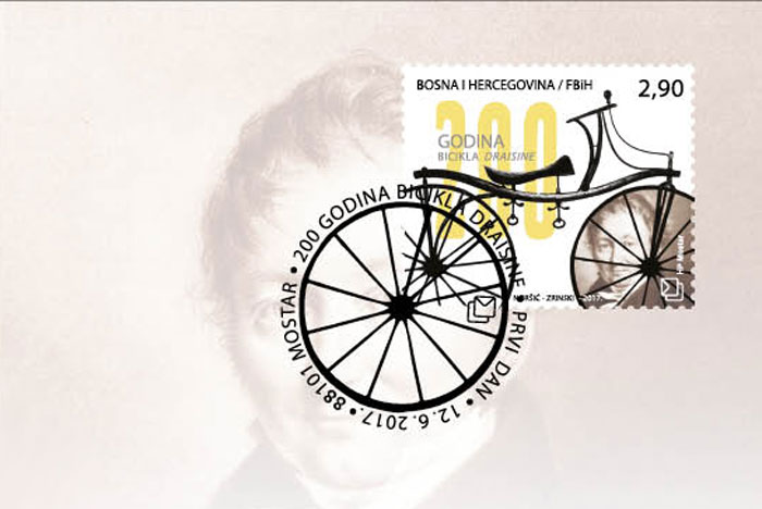 Hrvatska pošta (HP) Mostar izdala je prigodnu poštansku marku „200 godina bicikla draisine“ u arku od 9 maraka, žig i omotnicu prvoga dana (FDC).