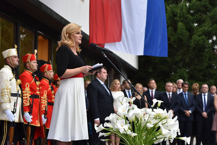 Prije tri dana obilježili smo Dan antifašističke borbe. Predsjednik Tuđman kao antifašist, ali i kao povjesničar bio je svjestan značenja toga datuma u kontinuitetu naše borbe za slobodu i očuvanje državnosti i zato ga je utemeljio kao državni blagdan. Taj kontinuitet trebamo čuvati, no istodobno nemamo razloga i nećemo slaviti simbole ni osobe koji su simbol ratnih i poslijeratnih zločina jugoslavenskog komunističkog režima, koji je odgovaran za mnoge desetke tisuće žrtava. Stoga moramo i dalje istraživati stratišta i masovne grobnice tih žrtava i na dostojan im način izraziti poštovanje. Gledajmo dakle u budućnost, kao što smo gledali i 25. lipnja 1991. Neka nam današnji dan bude nadahnuće, prije svega u tome koliko je važno imati jasne ciljeve i odlučnost u njihovu postizanju. Politička stabilnost u tome je od prvorazredne važnosti. Ona prije svega počiva na većinskoj volji zastupnika u Hrvatskome saboru i na odgovornoj suradnji između svih sastavnica državne vlasti, zatim i na otvorenosti državnih tijela za dijalog s oporbom, akademskom zajednicom i svijetom kulture, ali više od svega počiva na sposobnosti politike da prepozna temeljne životne interese hrvatskih državljana i hrvatskoga naroda u cjelini te na sposobnosti da ih artikulira i provede. A to pred sve nas, posebice mislim i na nas ovdje okupljene, koji predstavljamo sve vidike društvenoga života, postavlja najveću odgovornost za izgovorenu riječ i za izvršavanje dužnosti i obveza koje su nam povjerene. Staviti moć u službu općega dobra najviše je domoljublje”, zaključila je predjsednica.