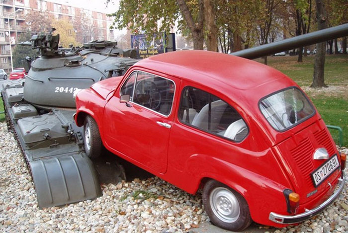 „Crvenog fiću“ osječkih registracijskih oznaka bezobzirno je pregazio tenk T-55 Jugoslavenske narodne armije, pri prolasku kolone tenkova JNA gradom Osijekom.