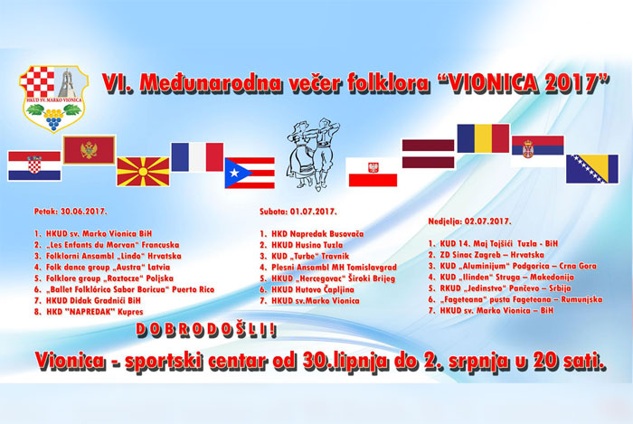 Od danas pa do nedjelje u organizaciji HKUD-a sv. Marko u Vionici će se održati VI. Međunarodna večer foklora “Vionica 2017.” na kojoj će nastupiti 23 kulturno-umjetnička društva iz 10 država: Hrvatske, Crne Gore, Srbije, Rumunjske, Makedonije, Francuske, Latvije, Poljske i nama daleka otočna karipska država Puerto Rico te BiH.
