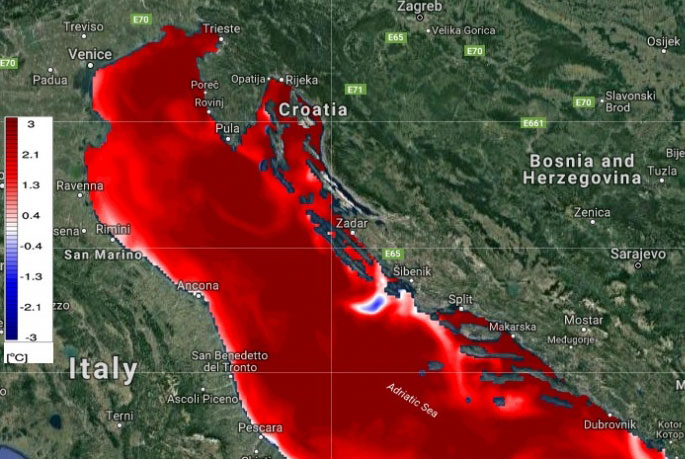 Aktualni toplinski val proteklih je dana dodatno zagrijao površinsku temperaturu Jadranskog mora. Najtoplije, s temperaturama od 29 do 30°C je duž najsjevernijih obala Italije (Friuli, Veneto) i sjeverozapadne Istre.