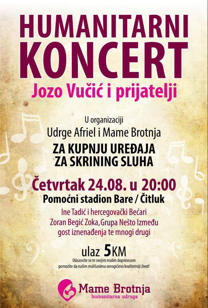 Tim povodom večeras će se održati humanitarni koncert „Jozo Vučič i prijatelji“ na pomoćnom igralištu stadiona Bare u Čitluku. Nastupaju: Ine Tadić i hercegovački Bećari, Zoran Begić Zoka, Grupa Nešto između, te gosti iznenađenja.