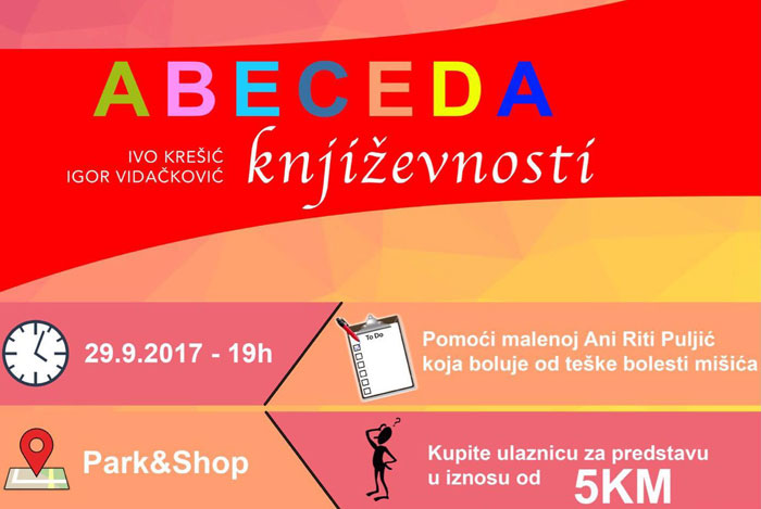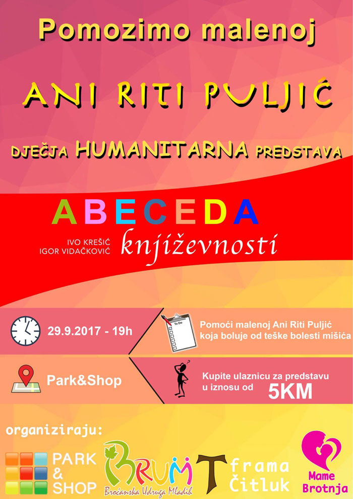 U veliku humanitarnu prikupljanja novca za liječenje malene Ane Rite uključili su se i Broćanska udruga mladih – Brum, Frama Čitluk i Mame Brotnja koje na platou Park&Shopa u petak, 29. rujna s početkom u 19 sati organiziraju dječju humanitarnu predstavu „Abeceda književnosti“ u izvedbi Ive Krešića i Igora Vidačkovića.