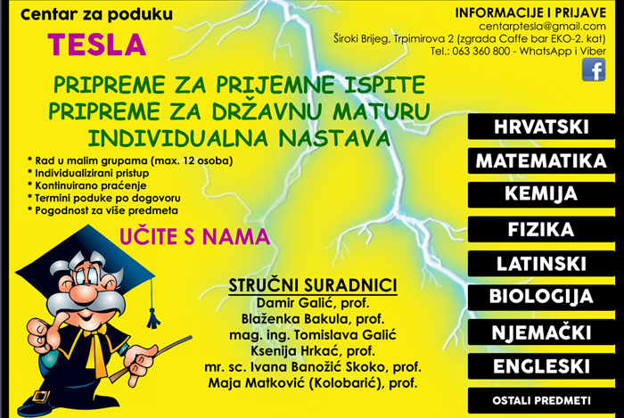 Centar TESLA će izvoditi pripreme za prijemne ispite i državnu maturu te individulanu nastavu po potrebi i zainteresiranosti učenika u manjim grupama do maksimalno 12 učenika.