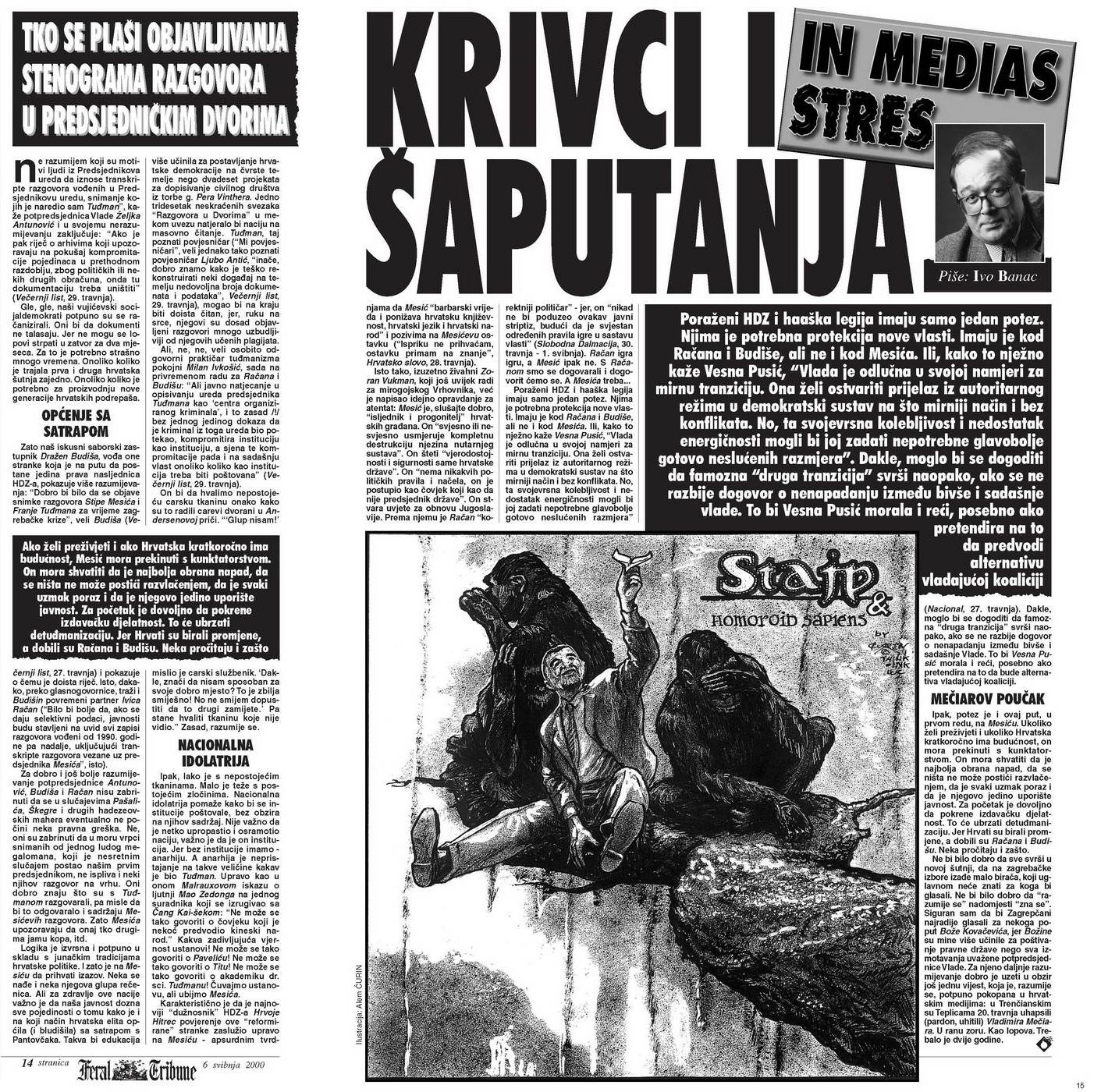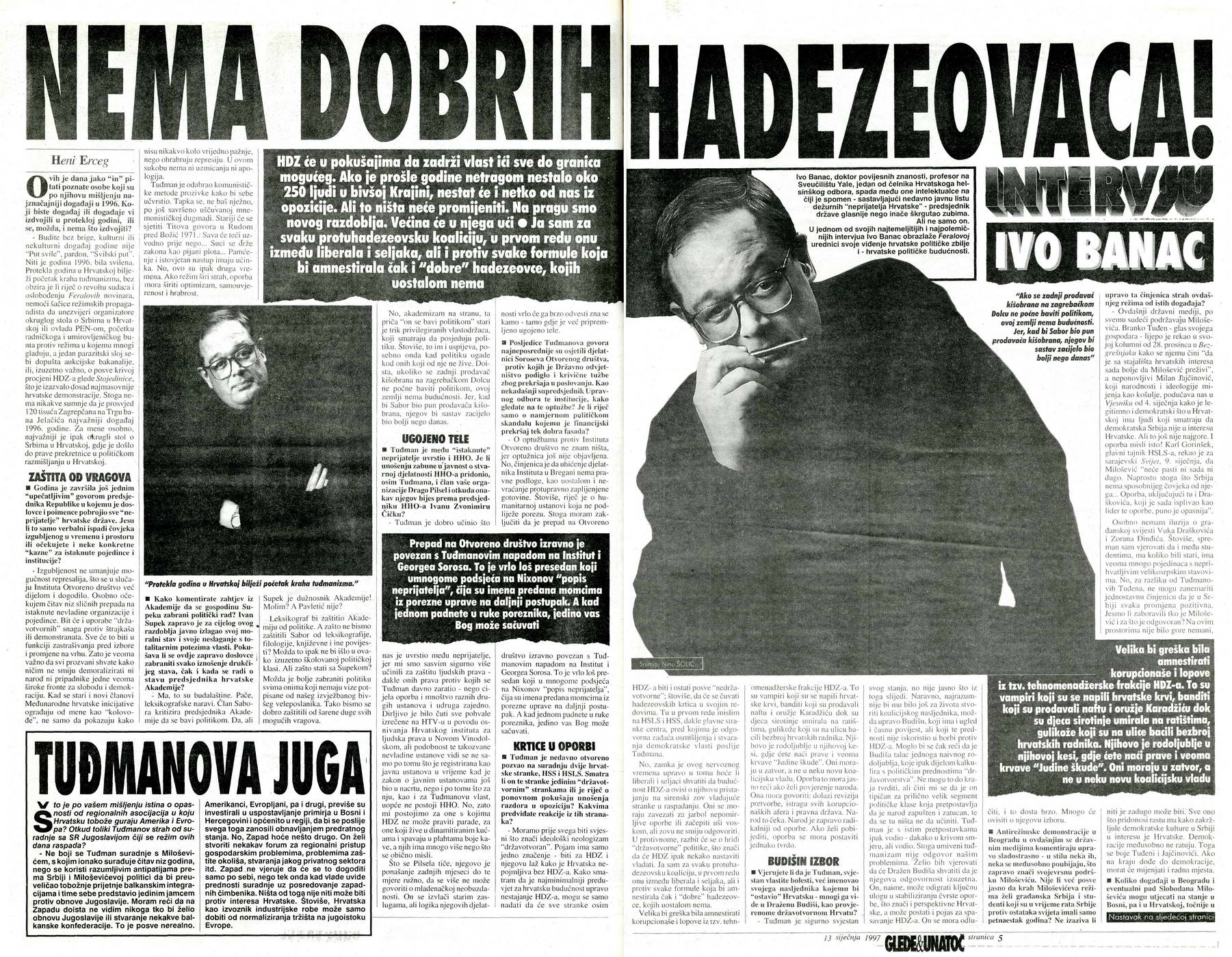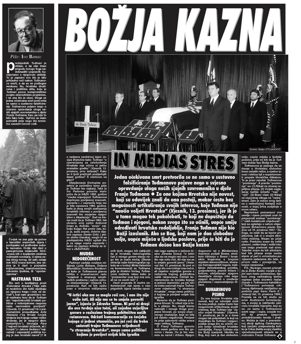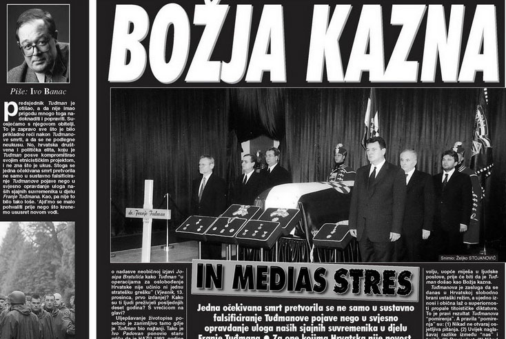 Ovaj mrzitelj Hrvata i muslimanski sluga, kako Sarajeva tako i njihovih zagrebačkih istpostava, oglasio se u kolumni za Feral povodom smrti prvog hrvatskog predsjednika Franje Tuđmana. U istoj tada piše kako je Tuđman Hrvatima bio Božja kazna i nesreća, kako za narod, tako i za državu. Naglašava u istoj da su desetljeće njegove vlasti obilježili dogovoreni rat s Miloševićem, podjela Bosne, etničko čišćenje hrvatskih Srba, hercegovački koncentracijski logori te demokratski deficit.