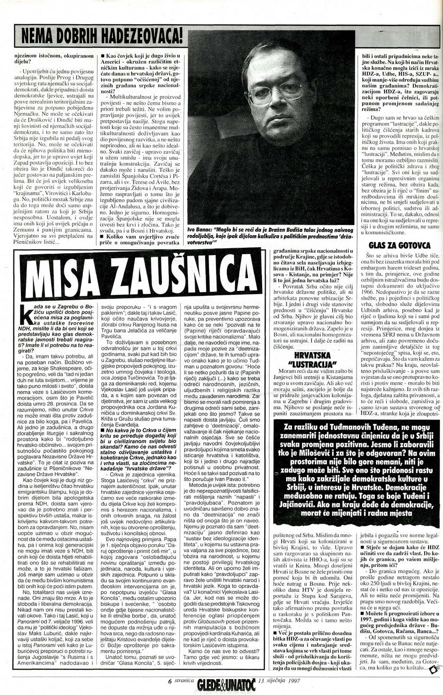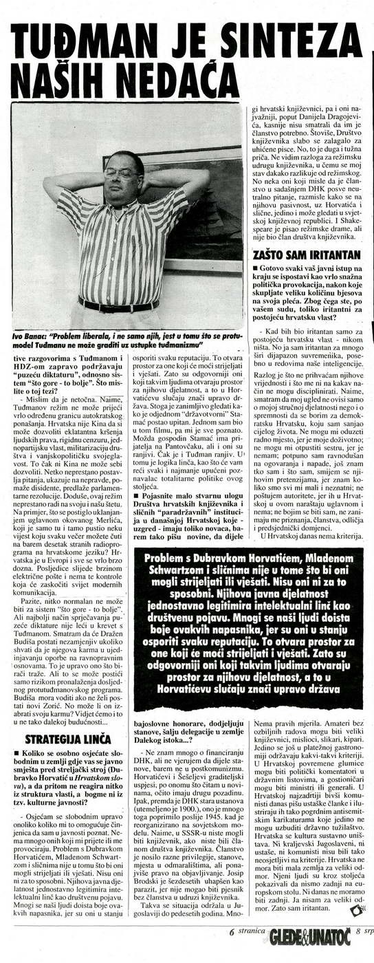 Tu međutim sa svojim tezama ovaj danas ugledni domoljub ne staje te u intervjuu za Feral iz 1992. godine u čak dva dijela tvrdi da je pokojni predsjednik sinteza svih nedaća i oličenje hrvatskog provincijalizma. Nadalje, u razgovoru za isti medij u 1997. godini također u dva dijela Banac protivnički progovara o amnestiji bilo kojeg HDZ-ovca jer dobrih HDZ-ovaca niti nema. I nekoliko godina kasnije u kolumni za Feral iz 2000. – tada mrtvog Tuđmana isti taj Banac naziva “satrapom s Pantovčaka i mirogojskim Vrhovnikom” te odobrava Mesićevo dilanje Tuđmanovih transkripata.
