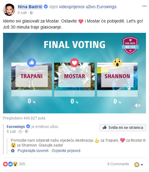“Idemo svi glasovati za Mostar. Ostavite <3 i Mostar će pobijediti. Let’s go! Još 30 minuta traje glasovanje.”
