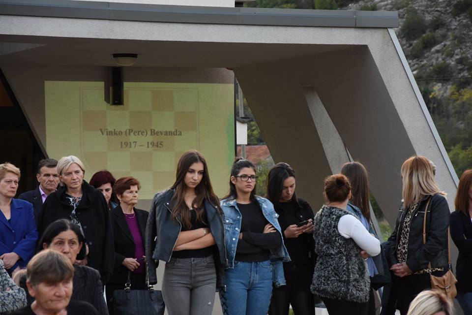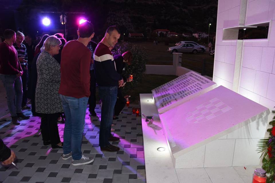 Večerašnja svečanost otkrivanja spomen obilježja poginulima iz Drugog svjetskog rata i poraća započela je puštanjem audio zapisa sa imenima poginulih, nakon čega je četvero mladih, koji su rodbinski vezani za poginule, donijelo zastavu do spomen obilježja, gdje su članice ženske klape Bura otpjevale Lijepu našu.