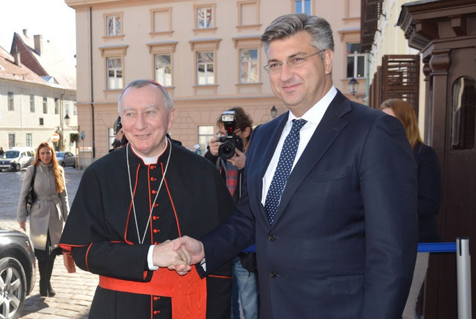 Predsjednik Vlade Republike Hrvatske Andrej Plenković sastao se danas, u Banskim dvorima, s državnim tajnikom Svete Stolice kardinalom Pietrom Parolinom.