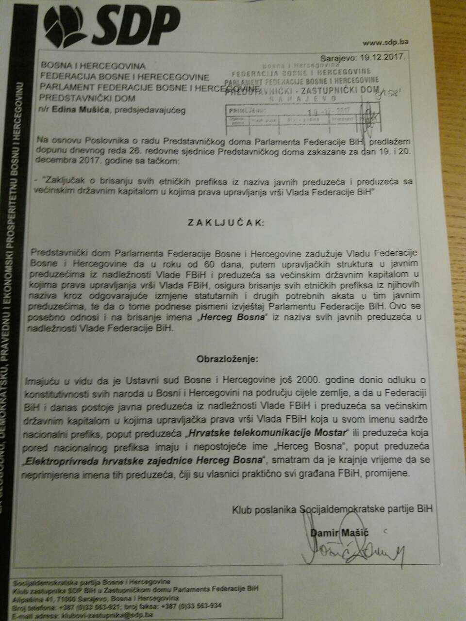 ”Imajući u vidu da je Ustavni sud BiH još 2000. godine donio odluku o konstitutivnosti svih naroda u BiH na području cijele zemlje, a da u FBiH i danas postoje javna poduzeća iz nadležnosti Vlade FBiH i poduzeća s većinskim državnim kapitalom u kojima upravljačka prava vrši Vlada FBiH koja u svom imenu sadrže nacionalni prefiks poput preduzeća “Hrvatske telekomunikacije Mostar” ili poduzeća koja pored nacionalnog prefiksa imaju i nepostojeće ime “Herceg – Bosna” poput preduzeća “Elektropriveda hrvatske zajednice Herceg Bosna”, smatram da je kranje vrijeme da se neprimjerena imena tih poduzeća čiji su vlasnici praktično svi građani FBiH, promjene – naveo je u obrazloženju Damir Mašić, predsjednik Kluba poslanika SDP-a u Parlamentu FBiH.