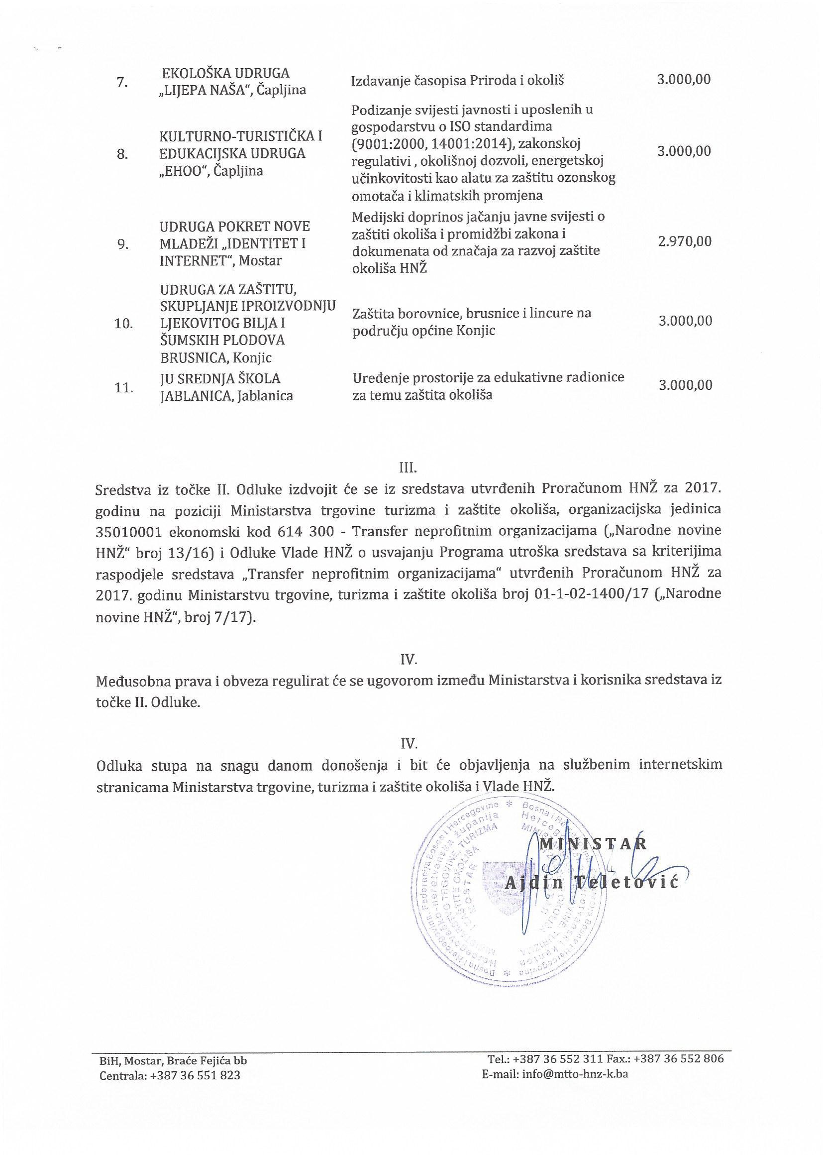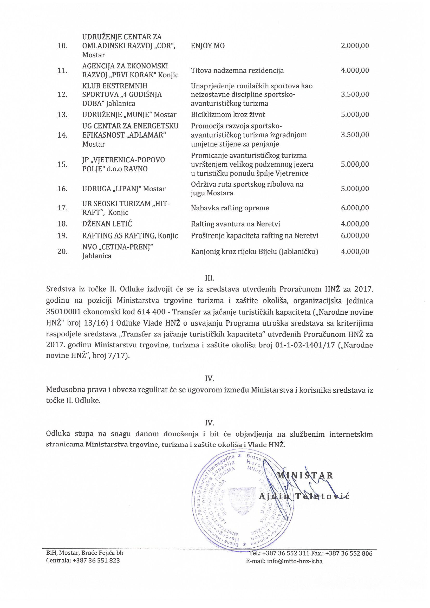 Temeljem Zapisnika povjerenstava za ocjenu ispunjavanja uvjeta i kriterija za dodjelu sredstava putem Javnog poziva, ministar trgovine, turizma i zaštite okoliša donio je odluke o izboru korisnika sredstava ”Transfer za jačanje turističkih kapaciteta” i ”Transfer neprofitnim organizacijama” utvrđenih Proračunom za 2017. godinu.