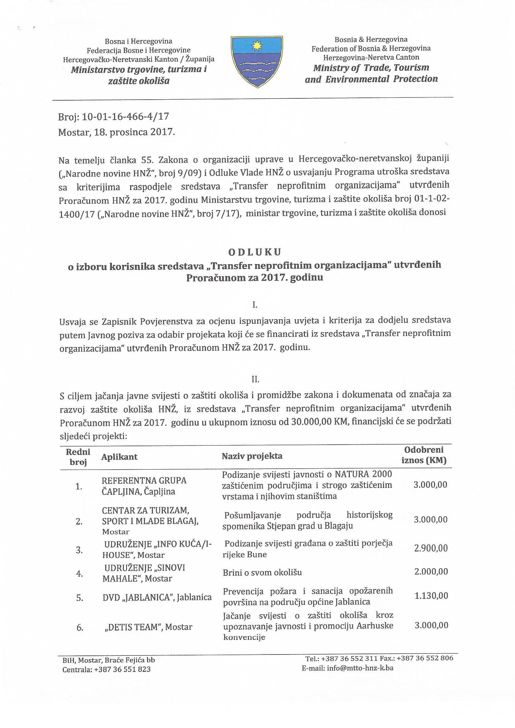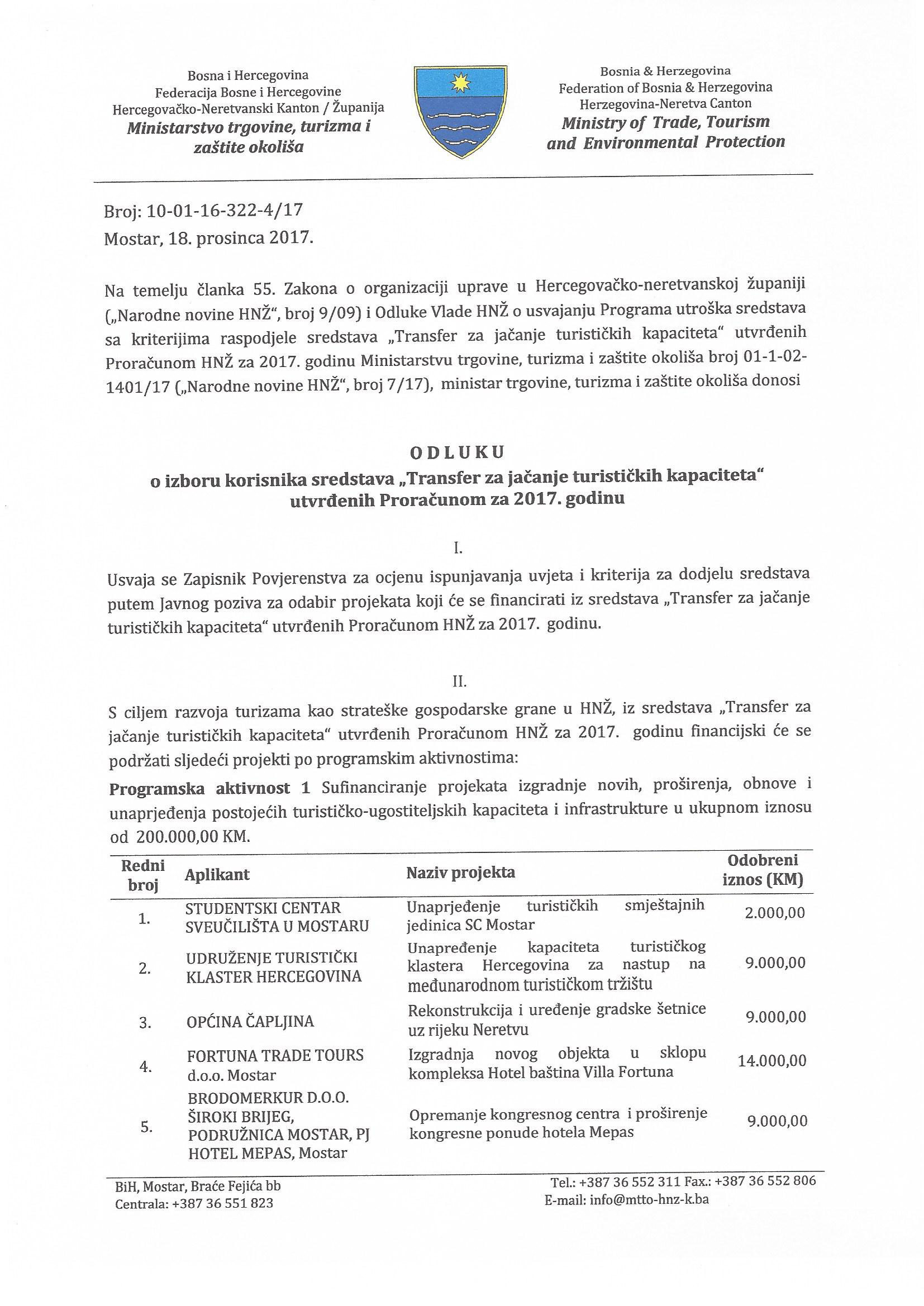 Temeljem Zapisnika povjerenstava za ocjenu ispunjavanja uvjeta i kriterija za dodjelu sredstava putem Javnog poziva, ministar trgovine, turizma i zaštite okoliša donio je odluke o izboru korisnika sredstava ”Transfer za jačanje turističkih kapaciteta” i ”Transfer neprofitnim organizacijama” utvrđenih Proračunom za 2017. godinu.