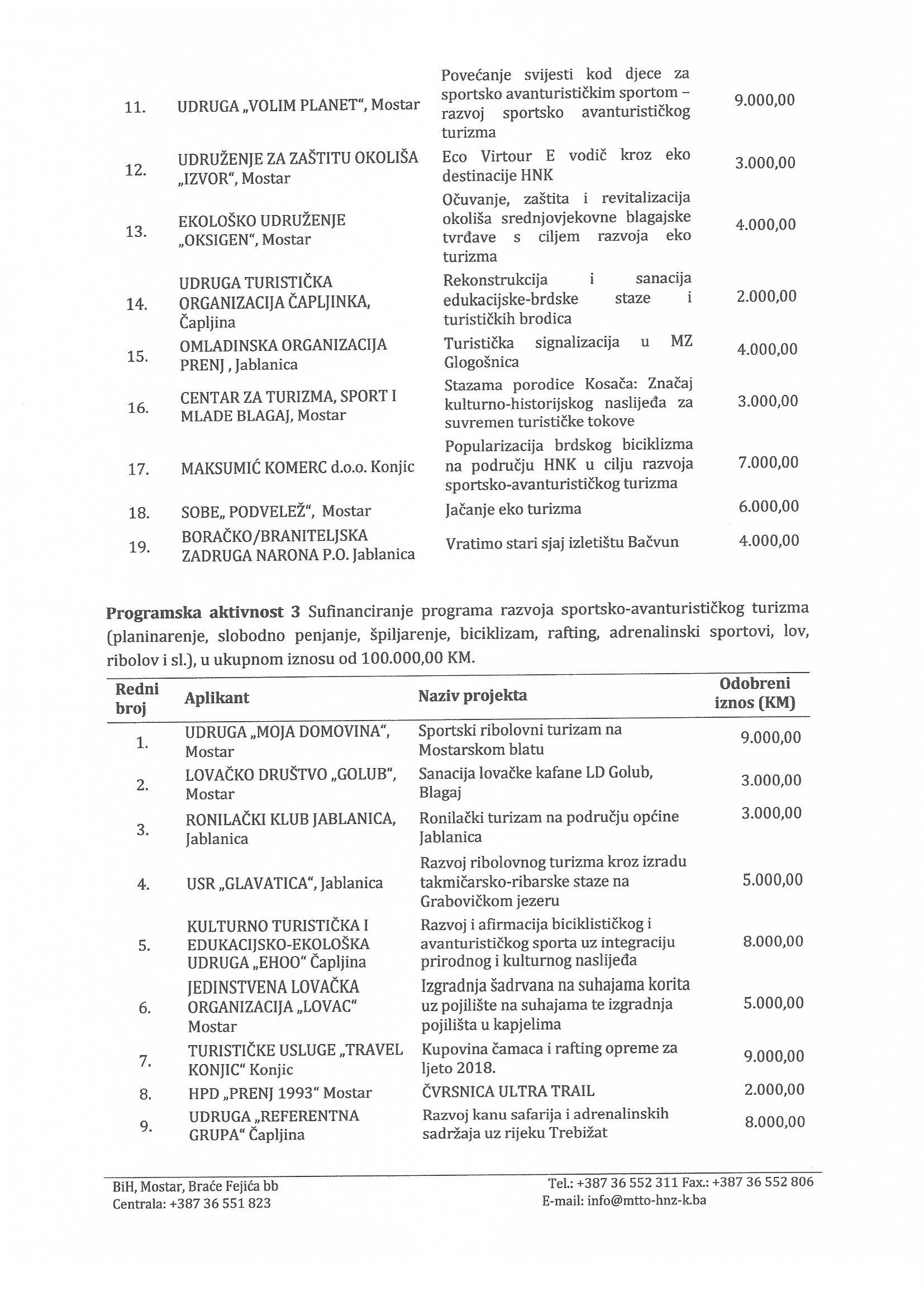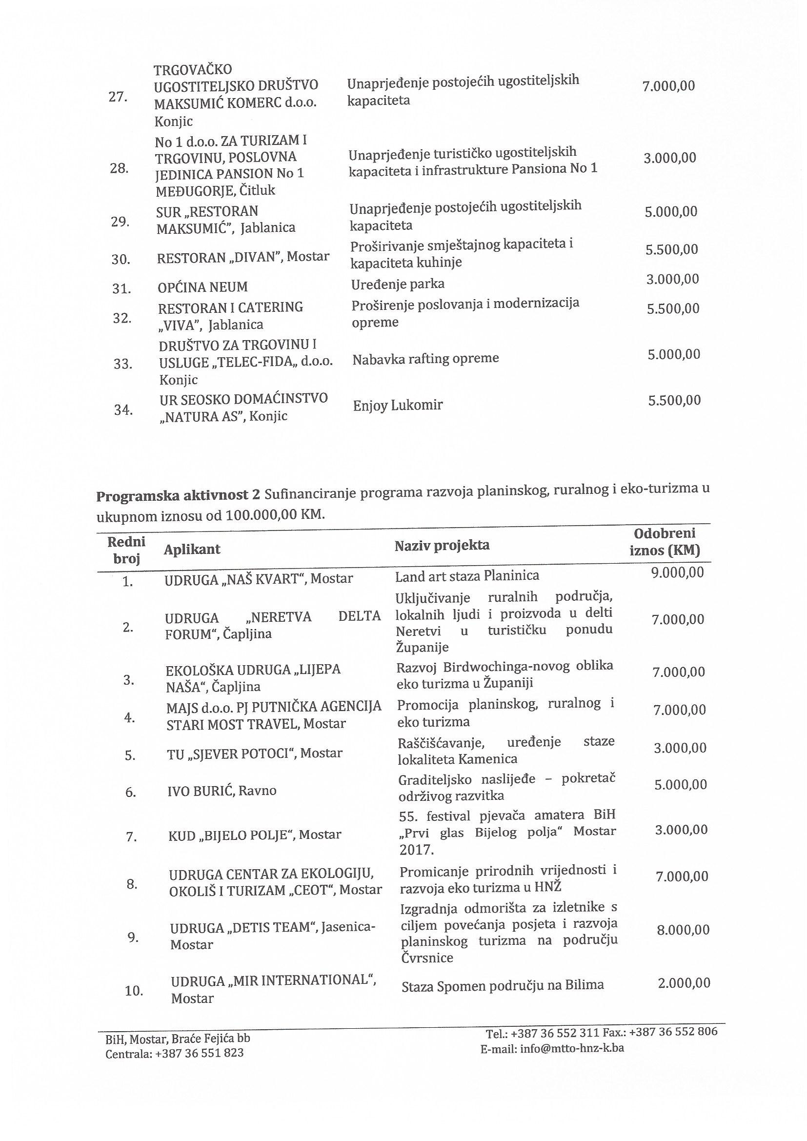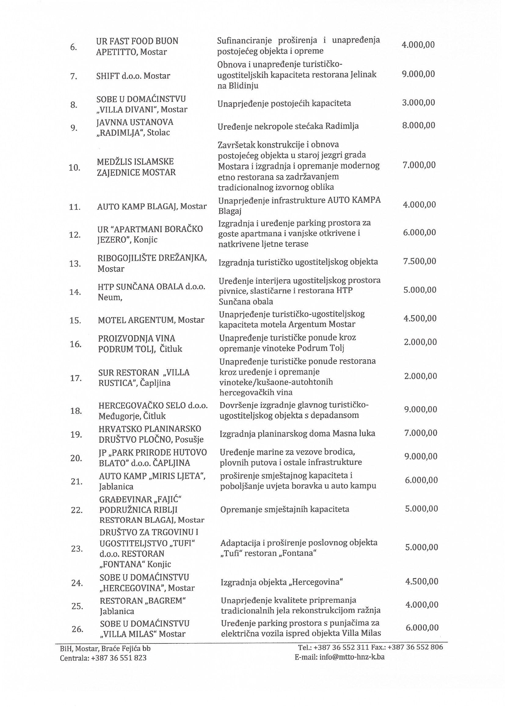 Potpisivanje ugovora s izabranim korisnicima bit će upriličeno u četvrtak, 21. prosinca i petak, 22. prosinca u vremenu od 9,00 do 15,00 sati u sjedištu Ministarstva (Braće Fejića bb, Mostar, ured broj 29 i 30).