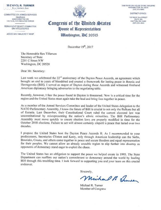 Američki kongresmen i nekadašnji gradonačelnik Daytona Mike Turner pisao je ovih dana američkom državnom tajniku Rexu Tillersonu ukazujući na prijeku potrebu da se Sjedinjene Američke Države okrenu regiji Balkana i preuzmu vodeću ulogu u procesu pomirenja. Predložio je potpisivanje “Daytona 2”.