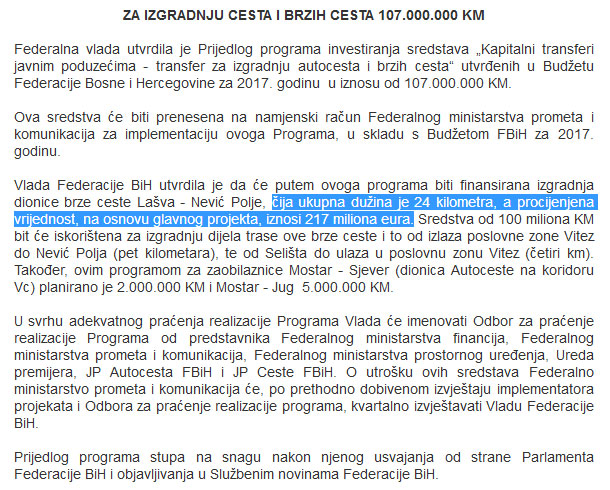 Federalna vlada utvrdila je Prijedlog programa investiranja sredstava „Kapitalni transferi javnim poduzećima – transfer za izgradnju autocesta i brzih cesta“ utvrđenih u Proračunu Federacije Bosne i Hercegovine za 2017. godinu u iznosu od 107.000.000 KM.