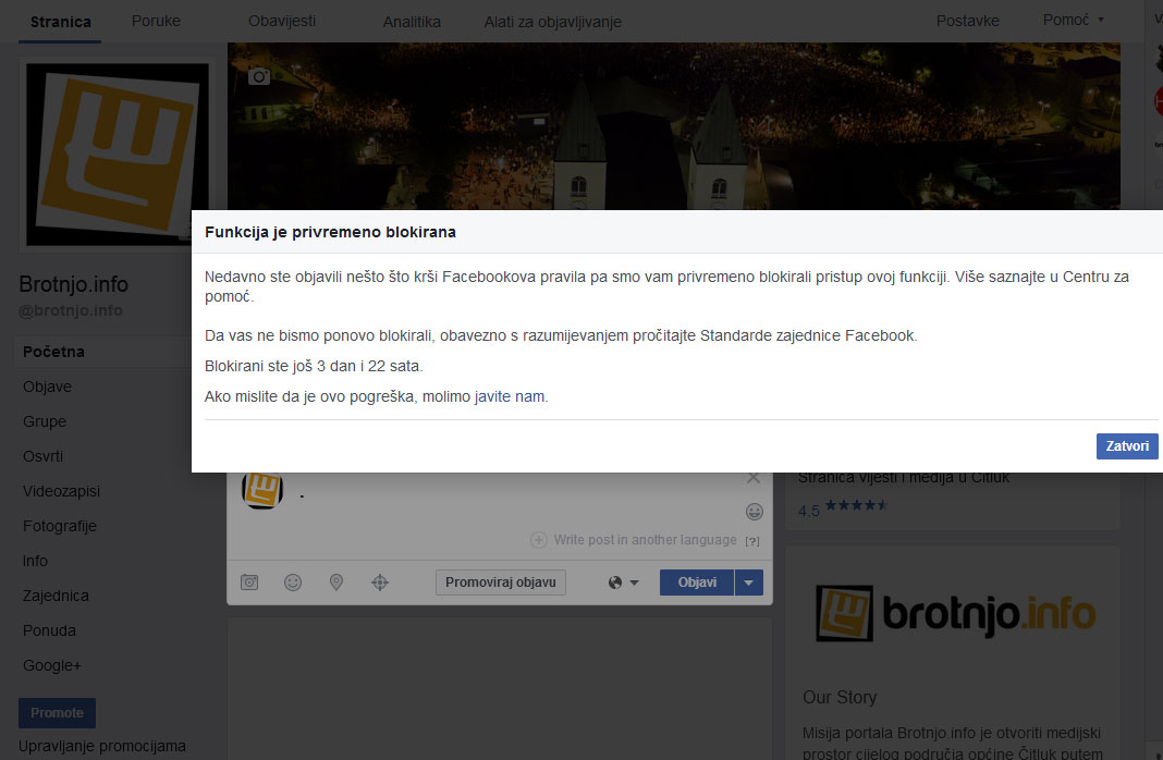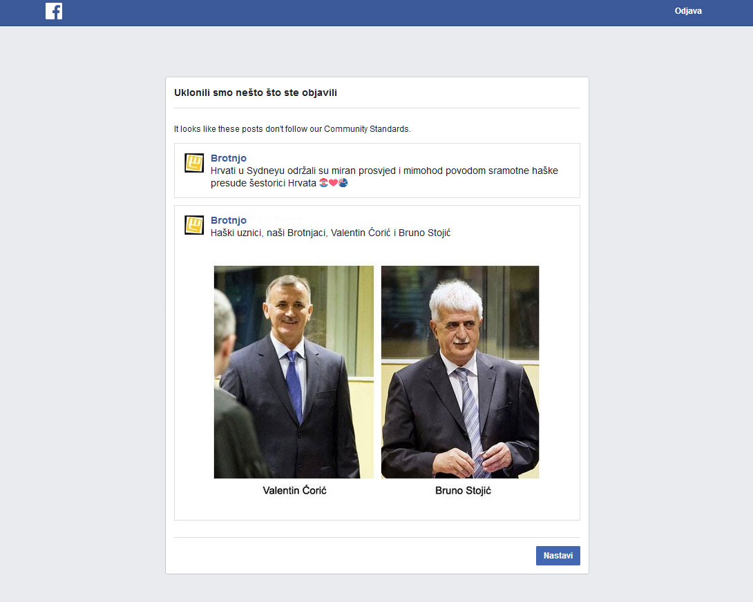 Posljedna u nizu je blokiranje dvije objave, prvo jedne fotografije stare skoro 10 mjeseci na kojoj se nalaze naša dva Brotnjaka Bruno Stojić i Valentin Ćorić, a druga je poveznica na članak „Prosvjed u Sydneyu: “Svojim činom Praljak je obvezao Hrvate na borbu za istinu”.