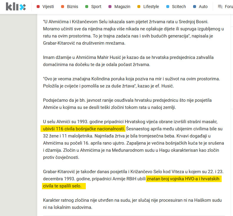 Naime, ovaj portal u vlasništvu dvojice braće, koji su usput po rođenju Hrvati, danas je izvješćujući o posjetu predsjednice Ahmićima i Križančevu Selu napisao sljedeće: