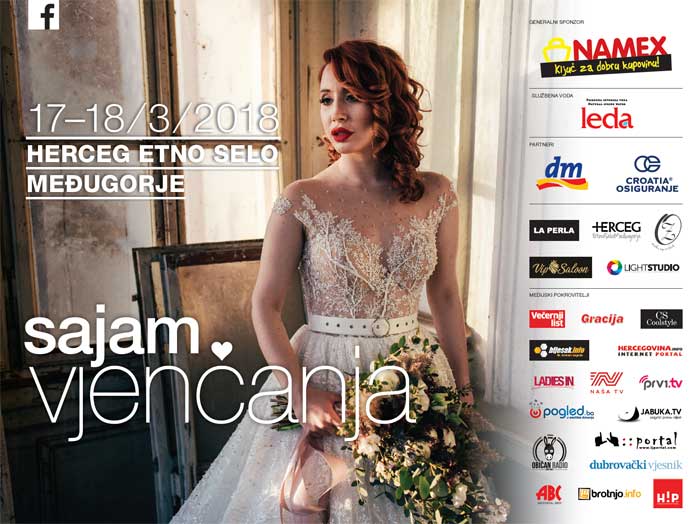 Sajam vjenčanja se i ove godine održava na dobro nam poznatoj lokaciji, u Herceg Etno selu i to 17. i 18. ožujka 2018. godine. Važnost Sajma vjenčanja i ove su godine prepoznali poznati i jaki brandovi: Generalni sponzor NAMEX te službena voda LEDA, te partneri: CROATIA OSIGURANJE i DM, LA PERLA salon vjenčanica, VIP SALOON, LIGHT STUDIO, te MAKE UP by ZDENKA koji će svim mladencima pomoći pri organizacija njihovog dana vjenčanja ali i budućeg bračnog života.