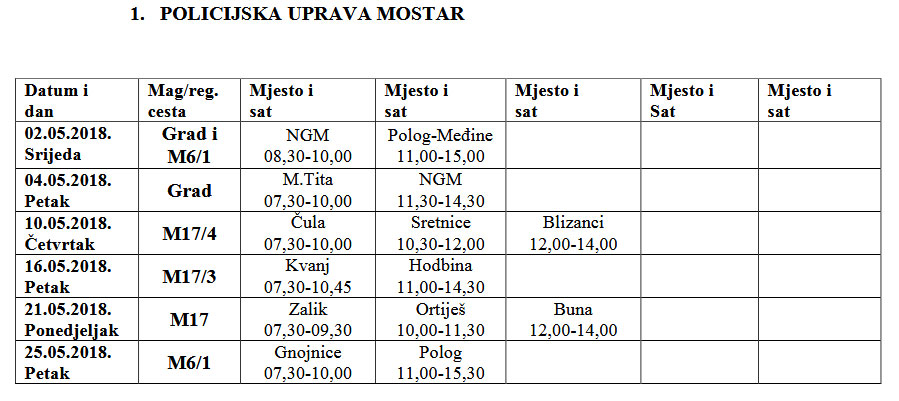 Prema objavljenom planu radarska kontrola na magistralnoj cesti M17.4 Mostar – Čitluk – Ljubuški planirana je za četvrtak 10. svibnja po sljedećem rasporedu: