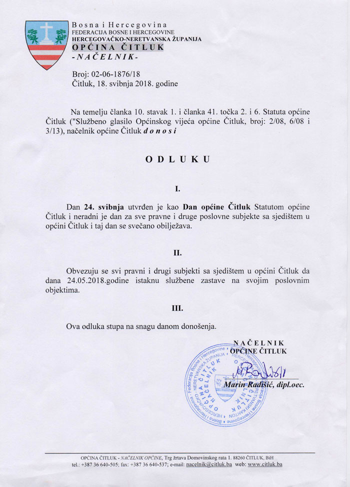 Ovom odlukom svi pravni i drugi subjekti sa sjedištem u općini Čitluk obvezuju se da na ovaj dan istaknu službene zastave na poslovnim objektima.