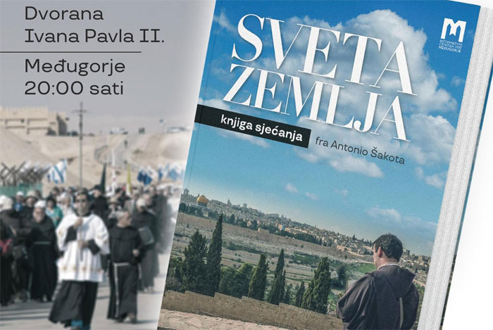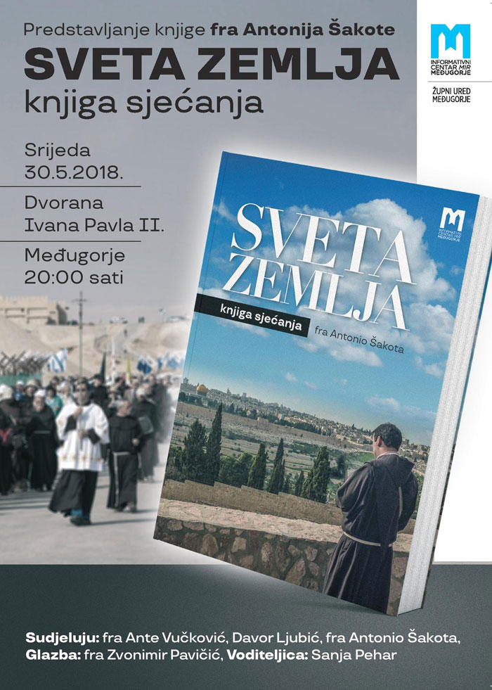 Predstavljanje knjige ”SVETA ZEMLJA knjiga sjećanja” fra Antonija Šakote održat će se danas, 30. svibnja 2018., s početkom u 20:00 sati u Dvorani Ivana Pavla II. u Međugorju.