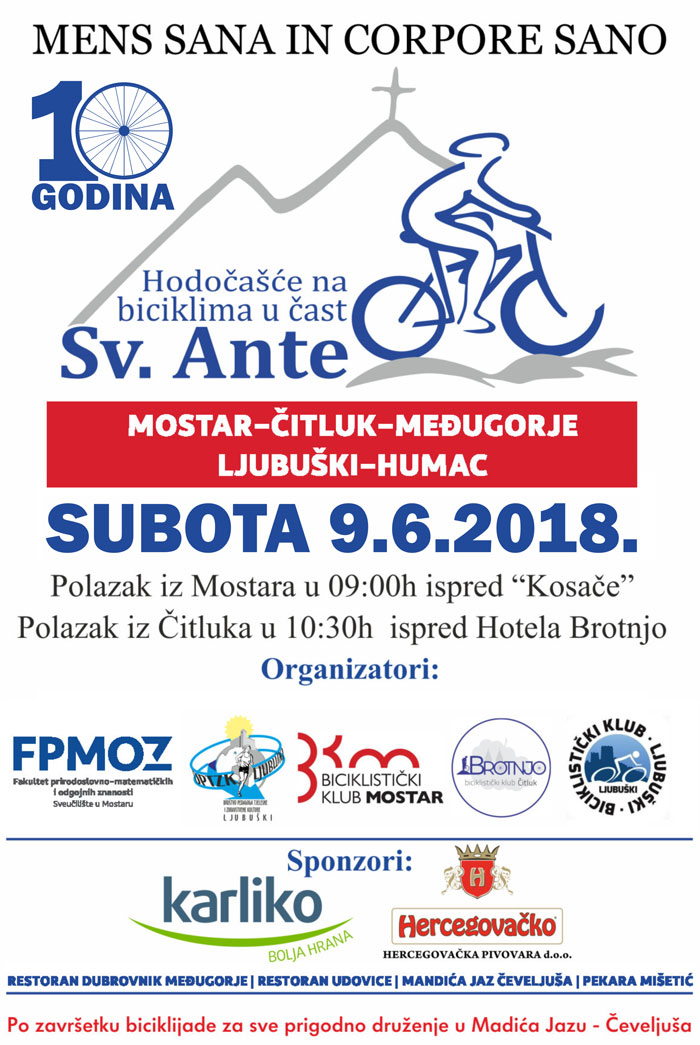 U organizaciji studija kineziologije – FPMOZ, Društva pedagoga TZK Ljubuški, te biciklističkih klubova Mostar, Brotnjo, i Ljubuški u subotu 09.6. održati će se deseto biciklističko hodočašće u čast sv. Ante.