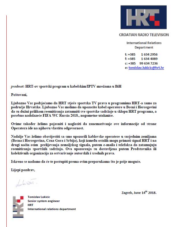 U prilogu dostavljamo i dopis HRT-a u kojemu traže zatamnjenje svojih kanala za vrijeme prijenosa utakmica Svjetskog prvenstva u nogometu – Rusija 2018. te dopis BHRT-a.